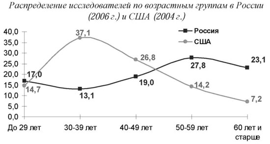 Динамика численности занятых в НИОКР определялась такими тенденциями, как ухудшение возрастной структуры: снижение доли исследователей в возрастной группе до 40 лет и возрастание доли исследователей в группе старше 60 лет. В отличие от России, в США, например, наибольшую долю среди исследователей составляют исследователи наиболее активной возрастной группы (30-50 лет).