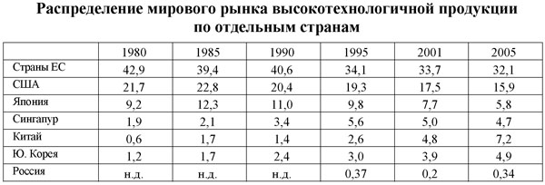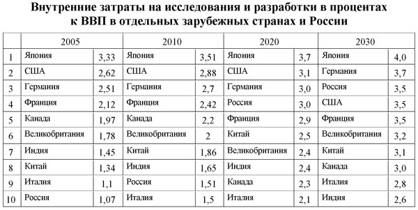 Принципиально важно, чтобы такой прогноз основывался на постановке "политического заказа", т.е. того желаемого будущего, которое видит для нации элита страны. Будущее в своих основных чертах закладывается и отчасти уже существует сегодня. Важно уметь увидеть его основные признаки, скорректировать существующие (или сформулировать новые) цели и задачи развития. Так, будущее нашей науки и технологий зависит уже сегодня, например, от затрат. "Россия значительно уступает развитым странам мира по уровню внутренних затрат на науку. Если в 1990 г. по величине данного показателя Россия находилась на уровне, сопоставимом с ведущими странами ОЭСР, то теперь она приблизилась к группе стран с низким научным потенциалом (Испания, Португалия, Венгрия, Польша). По абсолютным затратам на науку Россия более чем в 7 раз уступает Японии и в 20 раз - США[13].