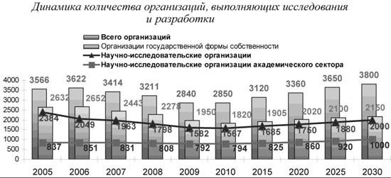 Количество организаций, выполняющих исследования и разработки, предположительно вырастет на 11%, причем в большей части за счет роста негосударственного сектора (рис.), которая с 2007 по 2030 г. снизится с 72% до 57%. При этом доля научно-исследовательских организаций академического сектора изменится незначительно - с 24% до 26%.