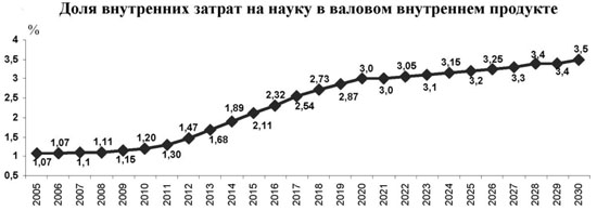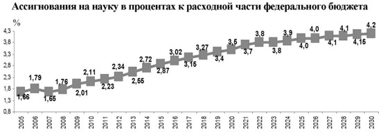Рост ассигнований на гражданскую науку из средств федерального бюджета способен катализировать процессы роста участия отечественных организаций в инновационной деятельности. При этом предполагается, что доля внутренних затрат на науку в валовом внутреннем продукте вырастет с 1,1 % (2007 г.) до 3,5 % в 2030 г., а доля ассигнований на науку в расходной части бюджета за этот же период вырастет с 1,65% до 4,2 % (рис.).