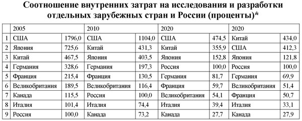 Это позволит России к 2030 г. выйти на третье место в мире по уровню наукоемкости в ВВП (табл.8). В количественном выражении это означает достижение Россией к 2020 г. 5 места в мире по уровню затрат на исследования и разработки (табл.).