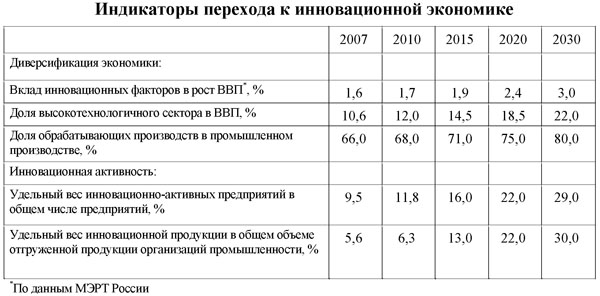 В качестве основного для российского общества результата от реализации данного сценария ожидается общее повышение инновационности экономики. В частности, увеличения с 2007 г. до 2020 г.: вклада инновационных факторов в рост ВВП с 1,6% г. до 2,4%, доли высокотехнологичного сектора в ВВП с 10,6% до 18,5%, доли обрабатывающих производств в промышленности с 66% до 78%, удельного веса инновационно-активных предприятий с 9,5% до 30 %, удельного веса инновационной продукции - с 5,6% до 22%. Основные индикаторы инновационной деятельности в прогнозный период будут изменяться в следующем направлении: