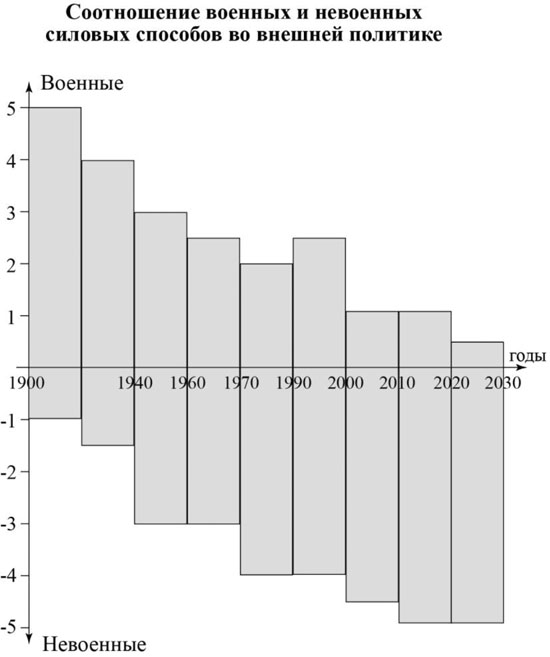 В зависимости от скорости процесса, его масштабов и последствий будут находиться способности государства к силовой политике, в том числе выборе силовых средств. Так, если признать, что конечной политической целью войны становится навязывание своей системы ценностей (а не захват территории, как прежде), то очевидна эволюция развития силовых средств, в пользу невоенных средств насилия, т.е. "мягкой силы":