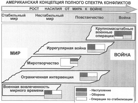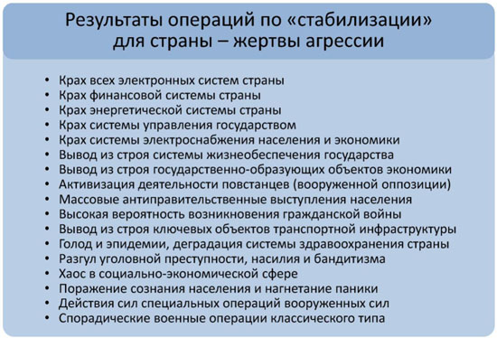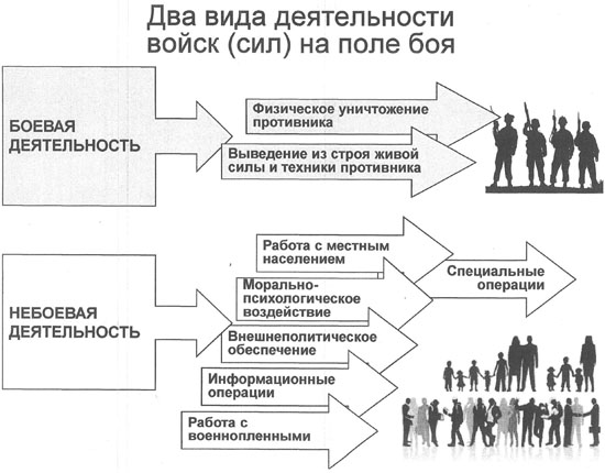 Происходит таким образом "вытеснение" традиционных военно-силовых средств вооруженной борьбы новыми, "контрценностными", имеющими силовое, в т.ч. военное значение, но не относящихся сегодня к средствам вооруженной борьбы. Речь идет о навязывании чужих представлений, образов, штампов, норм поведения (в том числе в области безопасности), концепций, не отвечающих национальным интересам России и т.п.