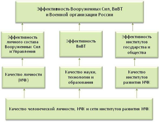 На другом рисунке может быть отображена взаимозависимость эффективности ВС страны и основных факторов, определяющих будущие национальные силовые возможности России: Как видно из этой (заведомо упрощенной схемы), эффективность ВС России будет зависеть в долгосрочной перспективе от 3-х групп ключевых факторов: