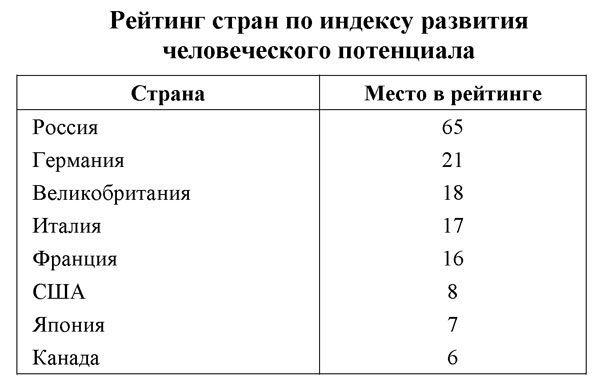 Россия так и не перешла ни в области идеологии, ни в области госуправления, ни в экономике к признанию приоритета интеллекта и человеческого потенциала, в т.ч. социального, а в более широком смысле - жизни человека. В качестве одной из основных угроз, кстати, это признается и в концепции МЭРа. Хотя, следует заметить, что за 2006-2007 годы кое-что сделано в этом направлении. Однако общую тенденцию изменить не удалось: Россия все первое десятилетие нового века по уровню развития человеческого потенциала занимала место в седьмом десятке государств[3].