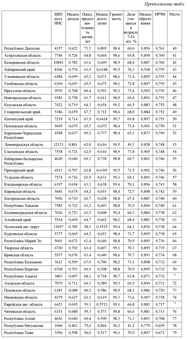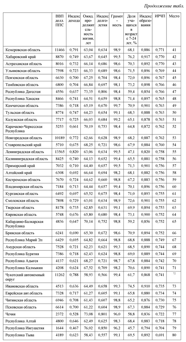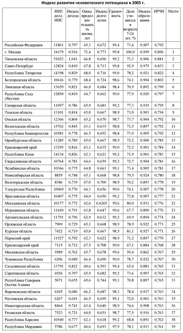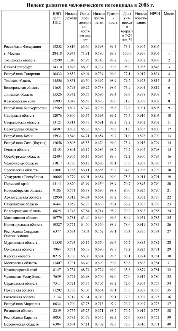 На самом деле ИРЧП в России не дает полного представления, ибо является среднеарифметическим индексом регионов, где ситуация заметно, даже радикально, отличается друг от друга. Так, региональный ИРЧП г.Москвы (0,896 - в 2005 г. и 0,907 - в 2006 г.), как и все его составляющие, вполне сопоставим с соответствующими показателями развитых стран. Если же в качестве противоположного примера взять Республику Тыву, то ИРЧП (в основном из-за показателей душевого дохода и продолжительности жизни) будет составлять 0,671 и 0,691 за 2005-2006 годы соответственно[4].