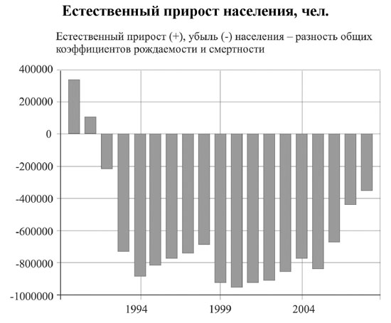 Напомним о той реальной ситуации, которая сложилась к 2007 году в этой области. По оценкам экспертов Общественной палаты, "... поколение детей лишь на 60% замещает поколение родителей, страна ежегодно теряет 700-800 тыс. человек. Начиная с 1992 г. смертность в России устойчиво превышает рождаемость. За 14 лет (1992-2005 гг.) разница между количеством родившихся и количеством умерших в России составила более 11,1 млн человек. Абсолютная убыль населения (с учетом 5,3 млн въехавших мигрантов) составила за этот период около 5,8 млн (около 400 тыс. человек в среднем за год). Данные последних лет демонстрируют нарастание масштабов убыли населения, за 2000-2005 гг. - около 700 тыс. человек в среднем за год.