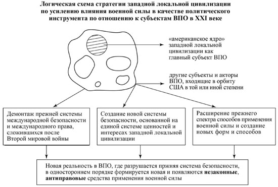 В этих условиях Запад открыто придерживается политики государственного терроризма, - как политики и идеологии, когда государство (группа государств) по отношению к другому государству (группе государств) или локальной цивилизации, становится основой для формирования одного из вариантов сценариев развития ВПО в XXI веке. Это политика не раз апробировалась США в XX веке, ведь с 1942 года США ни разу не объявляли официально войны, участвуя постоянно в боевых действиях против многих государств.