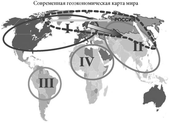 В этом смысле война, как продолжение политики насильственными средствами, остается в представлении Запада классическим и универсальным инструментом разрешения любого международного конфликта - политического, финансового, нравственно-религиозного. Это означает, что изменение основных факторов, влияющих на формирование МО и ВПО, является уже само по себе основанием для будущих силовых и военно-силовых методов разрешения конфликтов. Так, изменение соотношения мировых сил в пользу АТР в XXI веке уже есть самое серьезное основание (как, впрочем, и в прежней истории) до Западной цивилизации для подготовки войны. Российский исследователь С. Сулакшин, например, обозначая изменения в геополитической экономике, явственно демонстрирует основные регионы будущих военных конфликтов.