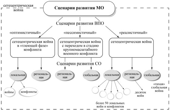 В любом случае однако из рисунка видно, что все сценарии развития СО являются не более чем вариантами одного военно-политического сценария (ВПО) реализации стратегии сетецентрической войны.