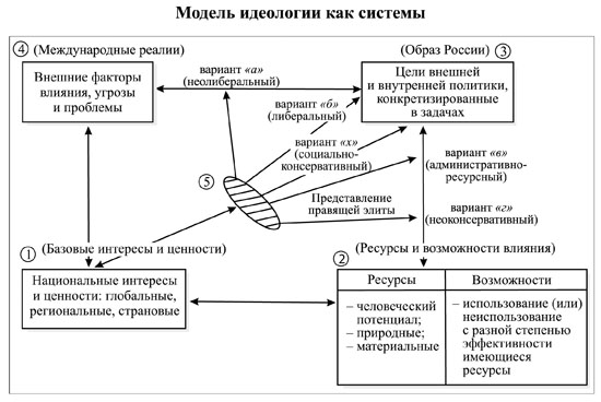 Структура работы построена таким образом, чтобы последовательно рассмотреть все элементы идеологической модели, а также, что очень важно, их влияние и взаимодействие друг на друга. Так, в предлагаемой модели, стрелками указаны факторы влияния, которые могут быть непосредственными (группа факторов "1" влияет на группу факторов "4" или "2"), а также опосредованы. Например, цели (группа "3") не линейно отражают национальные интересы (группа "1"), а через "преломление" в сознании элиты. Или элита воспринимает ресурсы и возможности не прямо, а через национальные интересы и цели.
