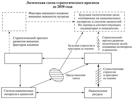 В основе такого выбора лежит принцип ориентации на национальные интересы и национальную систему ценностей, что может быть показано на несколько модернизированной логической схеме стратегического прогноза.