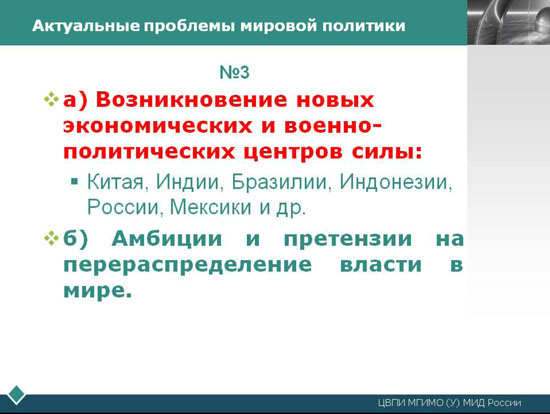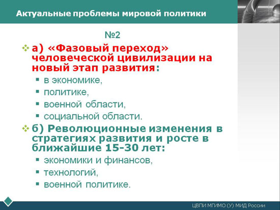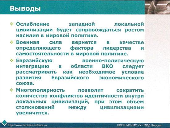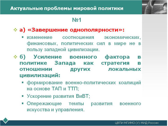 С точки зрения главного фактора, определяющего современное ВПО и СО, - противоборства локальных цивилизаций, основные особенности современной международной обстановки и вытекающие из них особенности военно-политической и стратегической обстановки являются следующим: