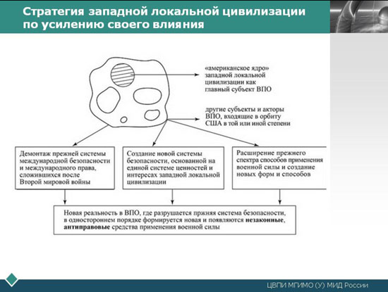 Началом нового этапа в отношениях между Западом и Востоком, двумя локальными цивилизациями, стало завершение "холодной войны", которое стало следствием решений правящей в то время части элиты в России прежде других стран. В конце 80-х и начале 90-х годов энергичная часть правящих элит в СССР и других социалистических странах оказалась не способной и не готовой продолжать "холодную войну" с Западом, посчитав, что политическая капитуляция окажется безболезненнее и выгоднее. И это политическое решение в корне изменило для восточной локальной цивилизации всю МО и ВПО в крайне невыгодном для нее ракурсе. Она была принуждена в конечном счете к постоянным уступкам, которые вели за собой лишь новые национальные, государственные, социальные уступки западной локальной цивилизации. Ее целью в 90-е гг. XX в. и в начале XXI веке было ассимилировать на своих условиях, нормах и правилах поведения большую часть восточной локальной цивилизации, а другую - дезинтегрировать и взять по контроль, когда территория, ресурсы, самоповедение уцелевших государств будут определяться западной локальной цивилизацией.