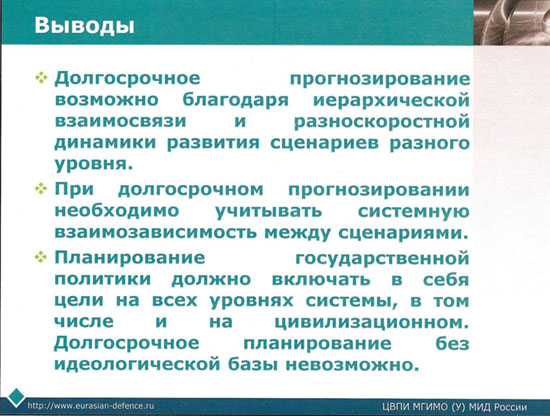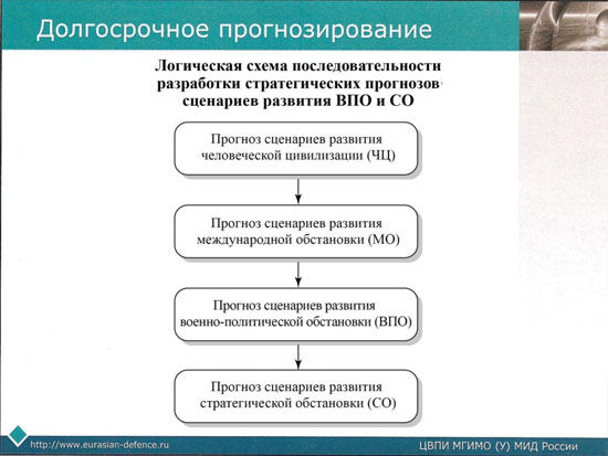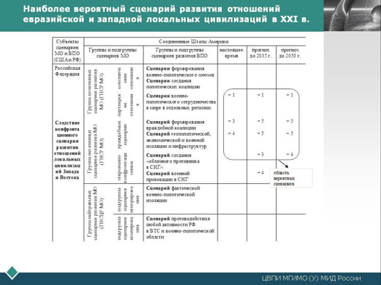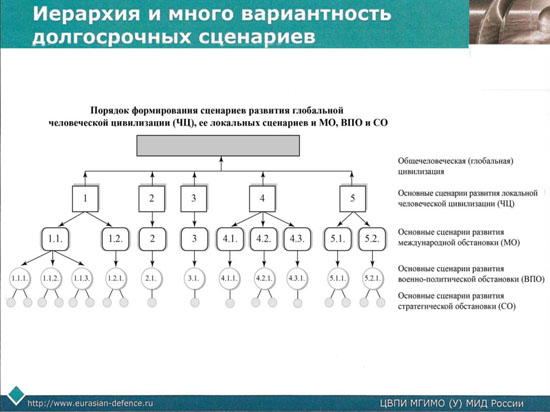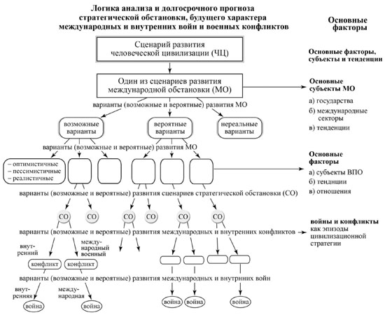 Как видно из рисунка, объективный сценарий развития СО находится в самом "низу" схемы, т.е. является производным от множества факторов, включая переменные величины и субъективные факторы влияния, но наиболее важные - цивилизационные - остаются на "самом верху", определяя количество сценариев и их вариантов развития. Причем наиболее важные факторы - политические, экономические, цивилизационные и ряд других, формируются не только "на самом верху", но и прямо транслируются на сценарий СО. Поэтому анализ СО, особенно если его пытаются делать военные эксперты, должен исходить из предварительного анализа более высокого уровня: