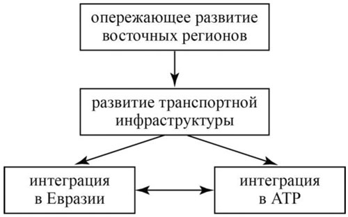 Сегодня две российские внешнеполитические концепции - евразийской интеграции и развития отношений со странами АТР - существуют раздельно. Они не связаны между собой не только политически, но и экономически. Более того, из этих концепций очевидно выпадают два других важнейших приоритета - опережающее развитие восточных регионов России и еще более быстрое развитие транспортной и иной инфраструктуры. Между тем такая взаимосвязь не просто существует, но и является определяющей. Ее схематично можно изобразить следующим образом в качестве причинно-следственной цепи или системы приоритетов.