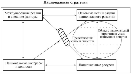 В более широком и, соответственно, точном представлении, Национальная стратегия близка к понятию "идеология" как системе взглядов элиты и общества на более широкий круг факторов, влияющих как на формирование целей Стратегии, так и на использование национальных ресурсов. Причем в этом более широком и правильном понимании особое значение имеет группа факторов, относящихся к категории "система национальных ценностей и интересов".