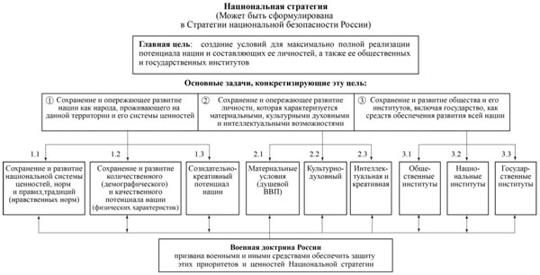 Так как Военная доктрина России является частью и производным от национальной стратегии, (не путать со стратегией национальной безопасности), то неизбежно требуется предложить, как минимум рабочее, самое общее толкование Национальной стратегии. На наш взгляд, в самом общем, концептуальном виде, она может быть представлена на следующем рисунке.
