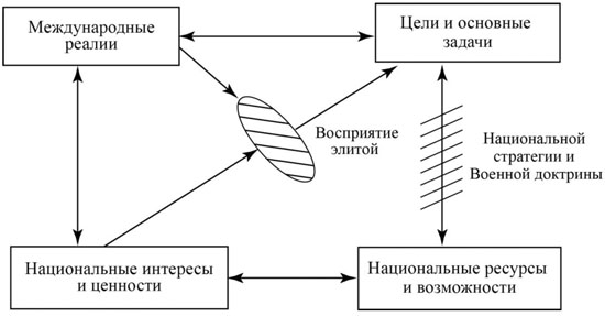 Как видно из рисунка, на Национальную стратегию и Военную доктрину (ее цели, задачи и ресурсы) влияют: