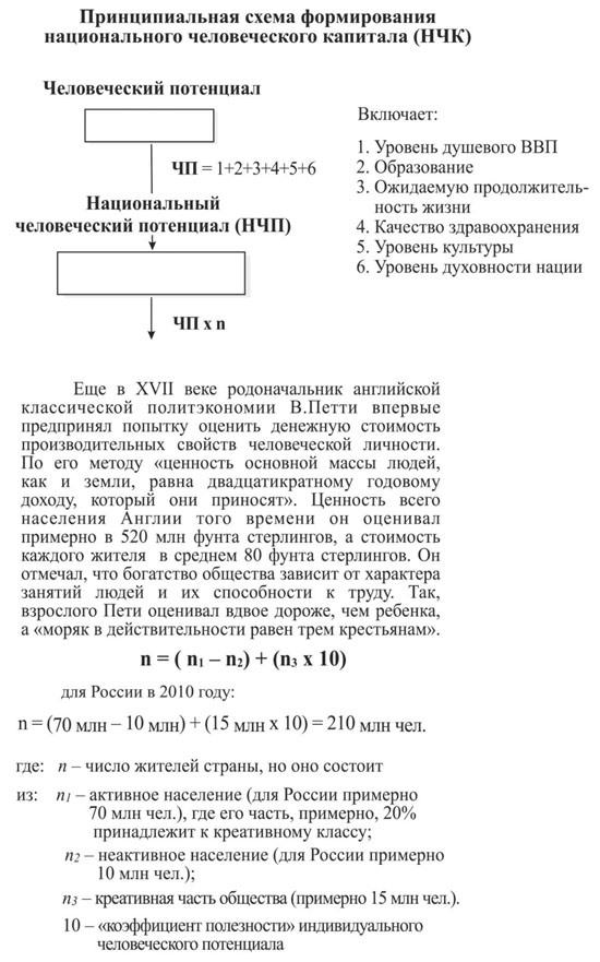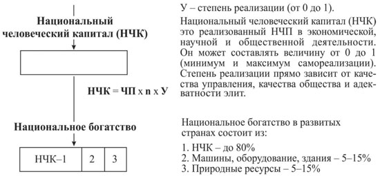 Таким образом, очевиден вывод: во-первых, величина национального богатства во все большей степени определяется НЧК, а, во-вторых, следуя логике, модернизация, как процесс и идея, должна предполагать для элиты, власти и общества не только и не столько модернизацию техники и технологий, сколько опережающее развитие НЧП и его эффективную реализацию, т.е. превращение потенциала в капитал (НЧП - НЧК).