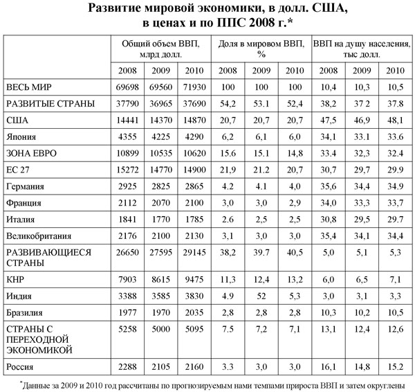 В целом мировая экономика в 2008-2010 годы (и соотношение экономических сил) выглядело следующим образом[18].