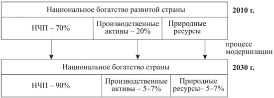 Таким образом, абсолютный и относительный рост НЧК в стратегической перспективе 20-30 лет окажется решающим при определении соотношения сил в мире и, как следствие, всей международной системы безопасности, международных институтов и национальных внешнеполитических стратегий. В этих условиях принципиально важно разработать такую государственную стратегию развития, которая отражала бы тенденцию роста значения НЧП. Прежде всего с точки зрения политики модернизации, которая должна быть ориентирована на ускоренную модернизацию НЧП. Сегодня, как известно, структура национального богатства развитых стран выглядит следующим образом.