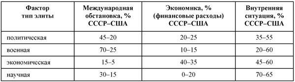В этой связи становится особенно актуальным исследование позиций представителей отдельных групп правящей российской элиты, которые существенно отличаются в зависимости от их профессиональной принадлежности. Попытка такого анализа на примере элит США и СССР на рубеже 60-х годов прошлого века сделаны профессором МГИМО(У) М. Хрусталевым. Картина, которая сложилась после проведенного конвент-анализа, показала различные подходы, существовавшие у разных групп советской и американских элит[20].