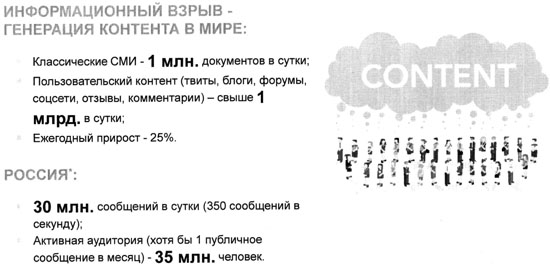 1. Огромных массивов информации (миллиарды сообщений ежедневно) и баз данных, в том числе и в социальных сетях. В частности, даже в России "информационный взрыв" свидетельствует о том, что объем информации будет продолжать увеличиваться в будущем.