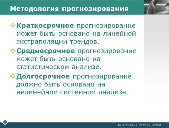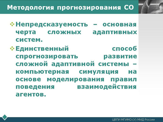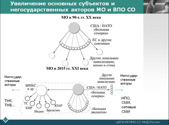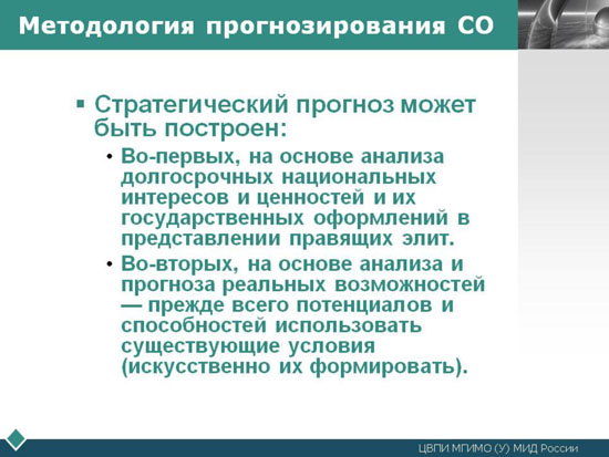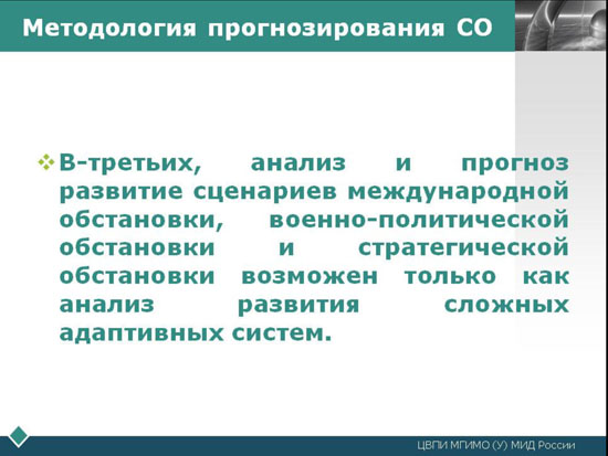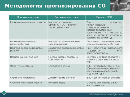 Особенно важно эта методика в связи с тем, что в XXI веке уже не существует одного центра силы, предопределяющего ход развития ВПО и будущую СО в своих основных чертах. Ликвидация этой заданности неизбежно ведет к умножению вариантов развития МО, ВПО и их мультипликации в СО.