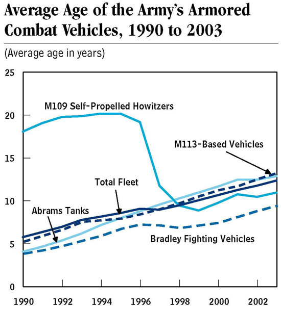 Как видно из графика, средний срок службы увеличился с 5 лет в 1990 г. до 15 лет в 2005 г., а некоторые виды и системы ВиВТ. Находящиеся на вооружении сегодня, в 2015 году, будут на службе и в 2050-е и даже 2060-е годы.