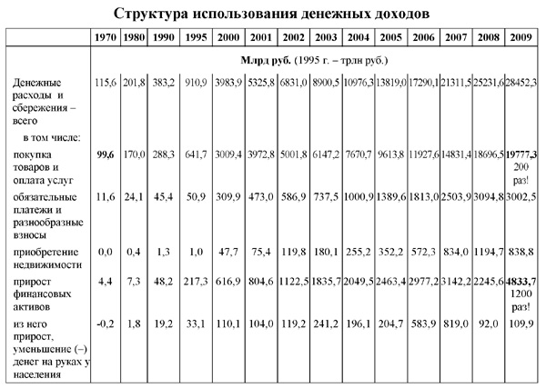 К сожалению, общество стремительно теряет веру в справедливость. При чем это неверие основывается прежде всего на распределении доходов среди различных групп населения, которое стало особенно показательным в период кризиса 2008-2011 годов, когда численность сверхбогатого социального слоя выросла, а реальные доходы граждан сократились. Это видно на примере структуры использования денежных доходов населения. Государственная политика в этой области привела, например, к тому, что объем средств на приобретение товаров и услуг за 40 лет вырос в 200 раз, а прирост финансовых активов - в 1200 раз[13]. Нетрудно предположить, что этот прирост приходился не на все население, а на его 1-2%.