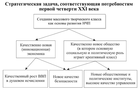 Очевидно, что возможность обеспечить себе качественные военную безопасность, экономику и общество лежит в плоскости новых знаний и творчества, причем и того и другого - в наименьшей степени заимствованного. Это означает, что, хотим мы того или нет, но во главу угла должна быть поставлена основная задача - создание массового креативного класса. Это и должно стать "стратегической целью" долгосрочного развития. Увеличение ВВП, а тем более формирование "нового образа будущей России" станут производными от решения этой задачи. Графически это может быть показано следующим образом.