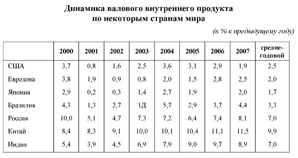 Так, в соответствии с оценками МЭР, "в первом десятилетии XXI века развитие национального хозяйства России характеризовалось более высокими темпами роста, как по сравнению с экономически развитыми странами мира, так и по сравнению с большинством стран с сопоставимым уровнем благосостояния. В 2000-2007 годах среднегодовые темпы роста России составили 7,0% против 4,0% мира в целом, 2,5% - США, 2,0% - еврозоны, 1,7% - Японии, 3,3% - Бразилии, хотя уступали Китаю - 9,9%. Устойчивый экономический рост повысил долю российского хозяйства в глобальной экономике с 2,2% до 2,9%"[16], но никак не отразился на ее месте по уровню развития НЧП. Она осталась в седьмом десятке стран.