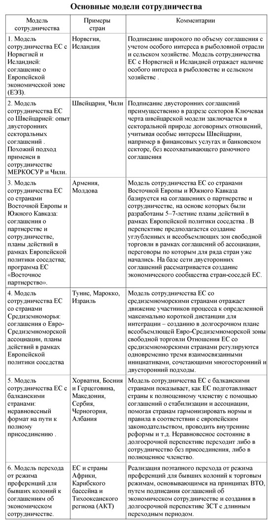 Так, выделяется шесть основных моделей взаимодействия крупных интеграционных объединений с соседними странами:
