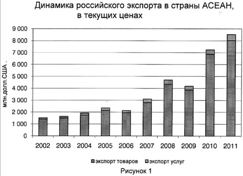 на основе российской статистикиВажнейшим каналом торгово-экономического сотрудничества является внешняя торговля, в которой выделяется два основных агрегата - торговля товарами и торговля услугами. Федеральная таможенная служба и Банк России, соответственно, сообщают сведения о совокупных объемах как экспортной и импортной торговли товарами и услугами России с зарубежными партнерами, из которых в отрытом доступе предоставлена статистика за последние десять лет, т.е. с 2002 по 2011 годы. Краткий анализ этих данных, суммированных в Приложении Б (см. таблицы Б.1-Б.4) дает представление о роли стран АСЕАН в торговых связях России.