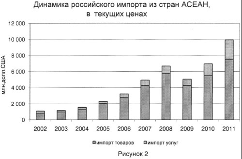 В то же время значение стран АСЕАН как поставщиков услуг в Россию уверенно возрастало на протяжении рассматриваемого периода - с 1,2% в 2002 до 2,7% совокупного импорта услуг Россией в 2011 году, хотя в 2003-2005 этот показатель составлял всего 0,7%. Стоимостной объем импорта услуг из стран АСЕАН достиг 2,4 млн долл. США в 2011 году.