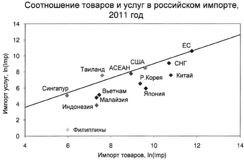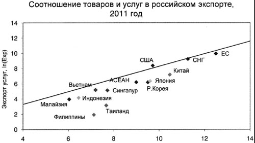 Для более наглядного отображения роли товаров и услуг в торговле России со странами АСЕАН используем сопоставление с другими крупными торговыми партнерами. Рисунок 3 составлен на основе данных таблиц Б.1 и Б.3 Приложения Б и показывает на логарифмической шкале значение экспорта услуг относительно экспорта товаров по странам АСЕАН и ряду крупнейших торговых партнеров России в 2011 году. Проходящая через график прямая характеризует соотношение товаров и услуг в совокупном российском экспорте во все страны мира. Очевидно, что услуги слабо представлены в российском экспорте в страны АСЕАН в целом и особенно - в отдельные ее члены, такие как Филиппины и Таиланд, если ориентироваться на средние показатели, в том числе по ЕС, США. Впрочем, такая ситуация характерна и для крупнейших партнеров России в Восточной Азии - Японии, Китая, Южной Кореи, что говорит о недостаточной конкурентоспособности российских услуг именно в этом регионе.