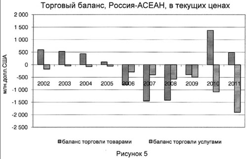 Резкий рост импорта услуг на фоне ограниченного экспорта можно отнести к основным причинам возникновения дефицита в торговле России со странами АСЕАН в последние годы или к значительному сокращению положительного сальдо (как в 2010 году, см. Рисунок 5, составленный на основе данных таблиц Б.1-Б.4 Приложения Б).