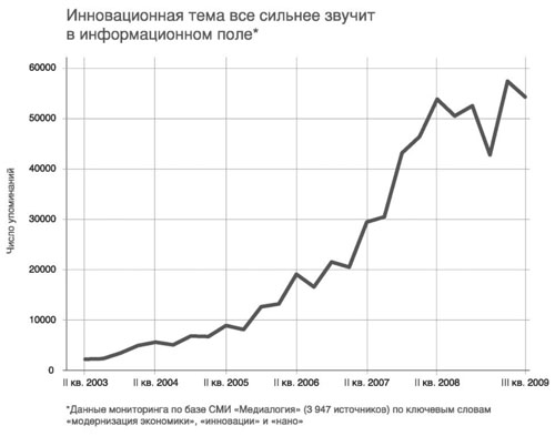 4. Создать систему мониторинга и рейтингования онлайн российских регионов, прежде всего по таким критериям, как индекс развития человеческого потенциала и индекс конкурентоспособности, которая была бы визуализирована для электронных СМИ (например, электронное панно в Екатеринбурге по аналогии с табло внешнего долга США на "Таймс сквер" и т.д.). Как видно, например, из доклада, подготовленного российскими экспертами для политического форума в Ярославле в сентябре 2010 года, внимание СМИ к инновационным процессам резко возросло[7].