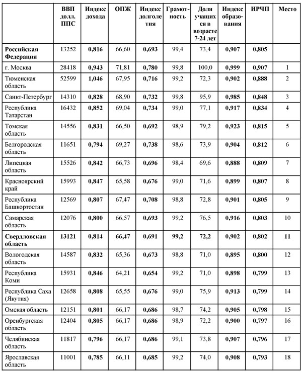 Учет ИРЧП по областям (штатам) стран официально не ведется. В России Независимый институт социальной политики (НИСП) ведет проект "Социальный атлас российских регионов" - ИРЧП по регионам России. На сайте этого института представлены данные за 2002-2006 годы (http://www.socpol.ru/atlas/indexes/), которые можно уточнять и конкретизировать. Вот, например, фрагмент отчета за 2006 год, который может быть взят за основу.