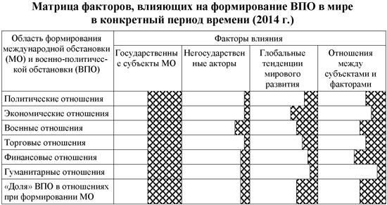 Из матрицы видно, например, что значение, "доля" ВПО при формировании МО может быть небольшой (или не быть вообще), либо значительной. Так, состояние ВПО на Ближнем Востоке во многом определяется МО, а именно уровнем политических, экономических и военных отношений России с Сирией и Египтом, а США - с Турцией и Израилем. В любом случае ясно, что: