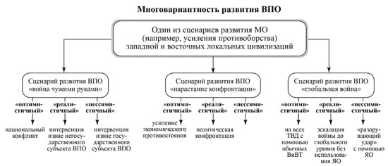 - во-первых, сценарии развития МО и их варианты во многом предопределяют сценарии и варианты развития ВПО. Это означает, что при негативном сценарии развития МО не может быть в принципе позитивного сценария развития ВПО. Он может быть либо кризисный, либо враждебный;