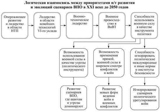 Именно приоритетность в развитии всех новейших направлений НТП, определяющих прежде всего характер VI-го технологического уклада становится решающим для военно-технического соревнования. Эта взаимосвязь очень просто и достаточно логично может быть показана на следующем рисунке.