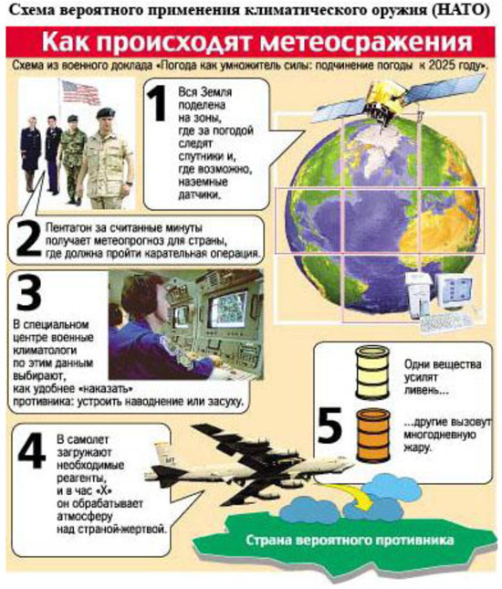 Кроме того, речь может идти, например, об использовании сил природы, в частности климата. Эти способы пока что рассматривались только как гипотетические (например, идея А. Сахарова об искусственных цунами), однако по мере развития и обострения ВПО в мире к ней неизбежно вращаться вновь. В частности, авторы одной из работ следующим образом видят эту картину[11].