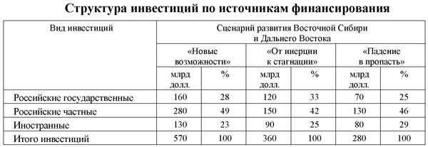 В структуре капитальных вложений во всех сценариях будут доминировать российские частные инвестиции. Доля иностранных инвестиций при их пониженном уровне будет максимальной в сценарии "Падение в пропасть", в результате чего произойдет снижение экономического суверенитета России на Востоке страны.