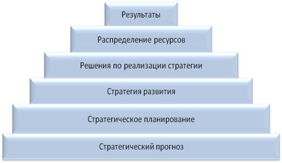 Как видно, "на вершине" пирамиды находятся результаты реализации стратегии, полученные после затраты неких ресурсов (финансов, времени и т.п.). Они зависят от качества принятых стратегических решений и эффективности самой стратегии, а та, в свою очередь, от качества прогноза и планирования.