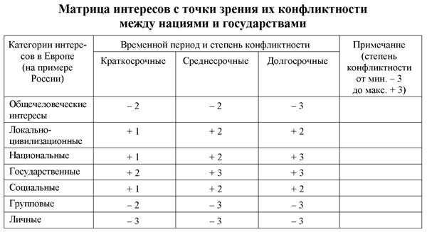 Как видно из матрицы конфликтности интересов (национальных и государственных) России в Европе в 2014 году достаточно существенна, в то время как личные и групповые интересы граждан РФ и Европы находятся практически вне конфликта.