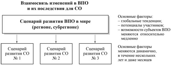Варианты сценариев развития ВПО во многом предопределяют сценарии развития СО, однако существует и обратная тенденция. Таким образом существует тесная взаимосвязь между этими вариантами сценариев при определяющей роли сценариев развития ВПО как более устойчивых, системных и многофакторных явлений, обладающих значительной инерцией. Так, во многом определяющие сценарии развития ВПО тенденции в военном строительстве, как привило, отличаются определенной продолжительностью, измеряемой десятилетиями. Сценарии же, развития СО, вытекающие из этих тенденций, могут измеряться годами и даже месяцами. На рисунке эту взаимосвязь можно показать следующим образом: