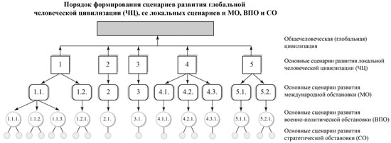 Если говорить о попытках прогноза ВПО и СО, вытекающих из сценариев развития человечества и международной обстановки, то таких попыток насчитывается существенно меньше. Главная трудность заключается в том, чтобы достаточно определенно вычислить сценарии развития самых верхних уровней - человеческой цивилизации, локальных цивилизаций - и вытекающих из них сценариев международной обстановки. При этом важно изначально не упустить ни одного из вариантов таких сценариев потому, что за каждым из них в конечном счете будет находиться несколько сценариев развития ВПО и еще больше - СО.